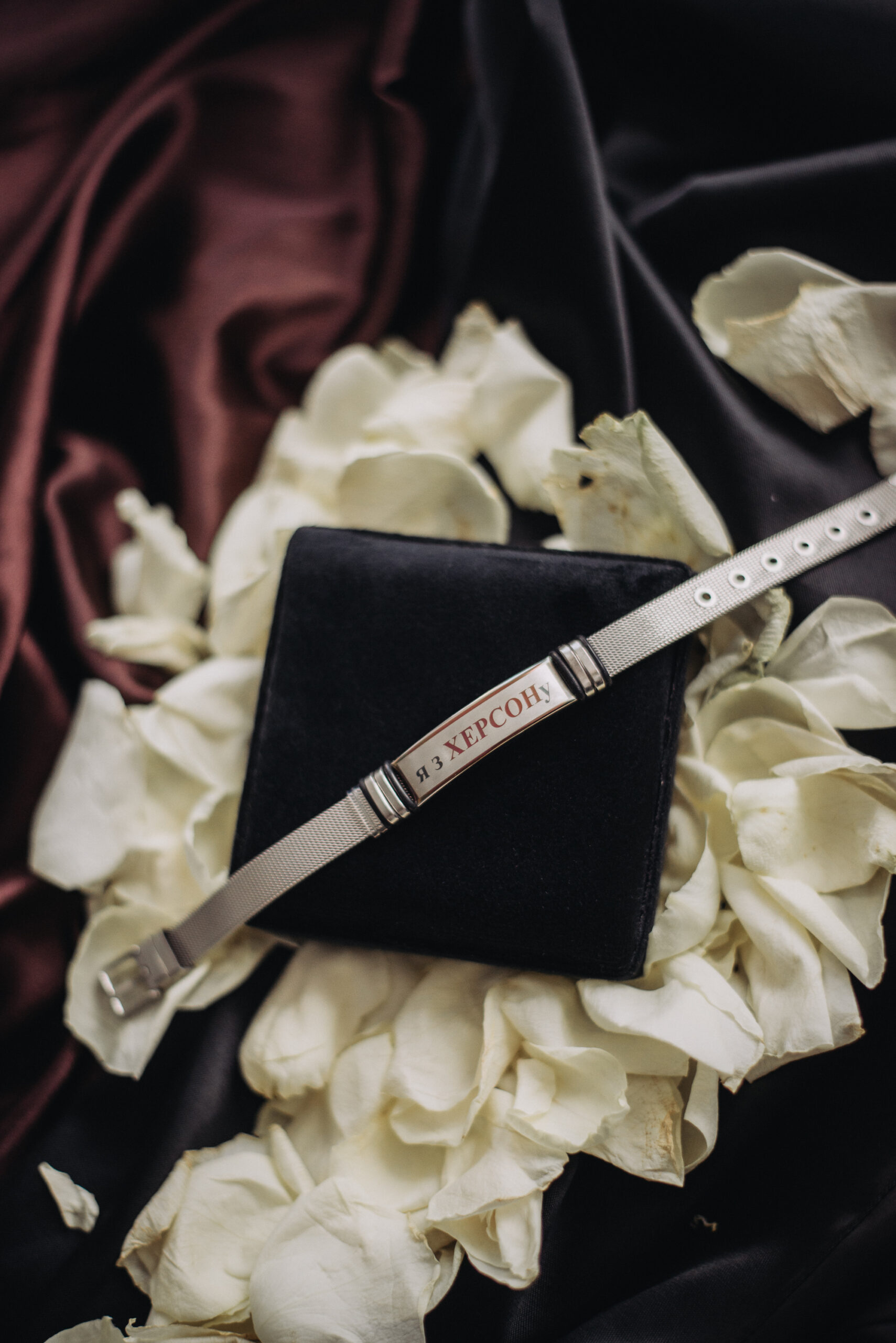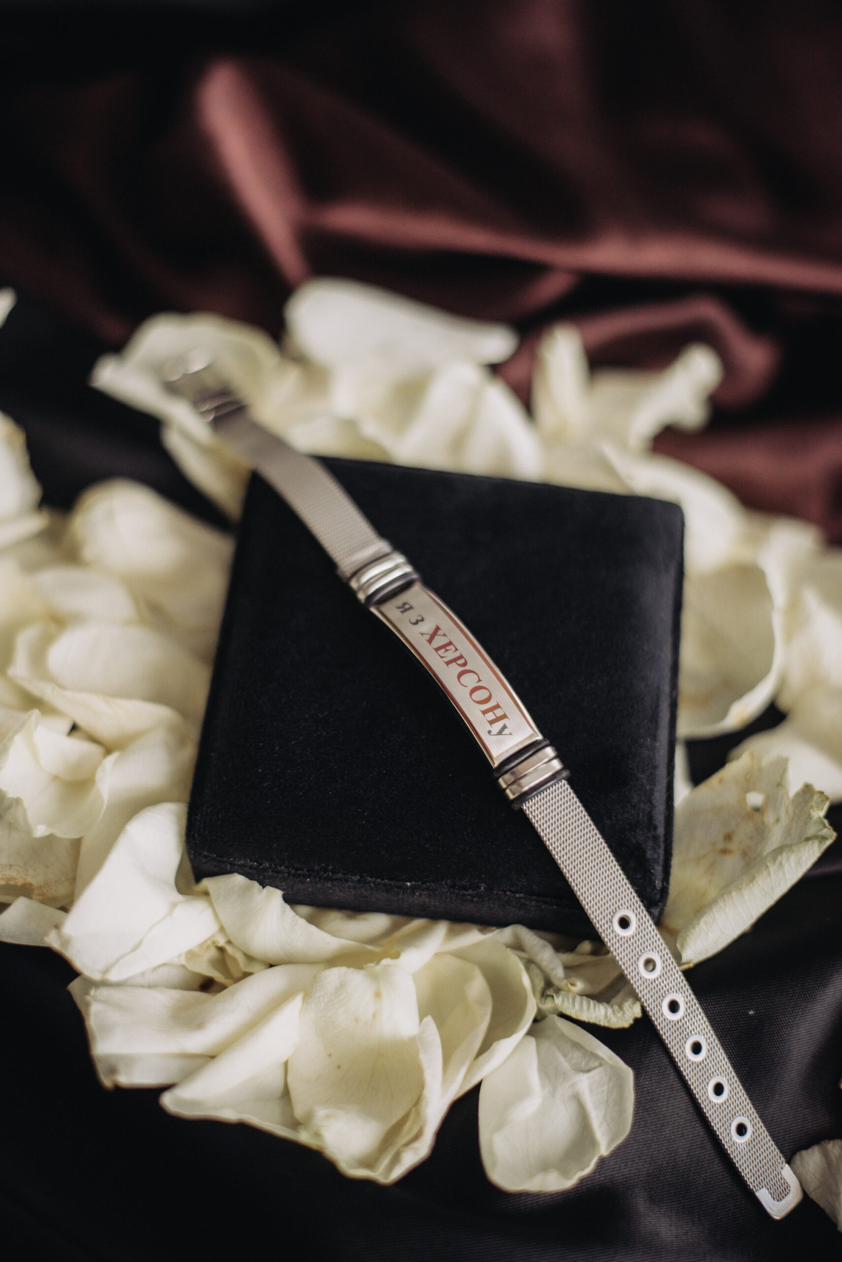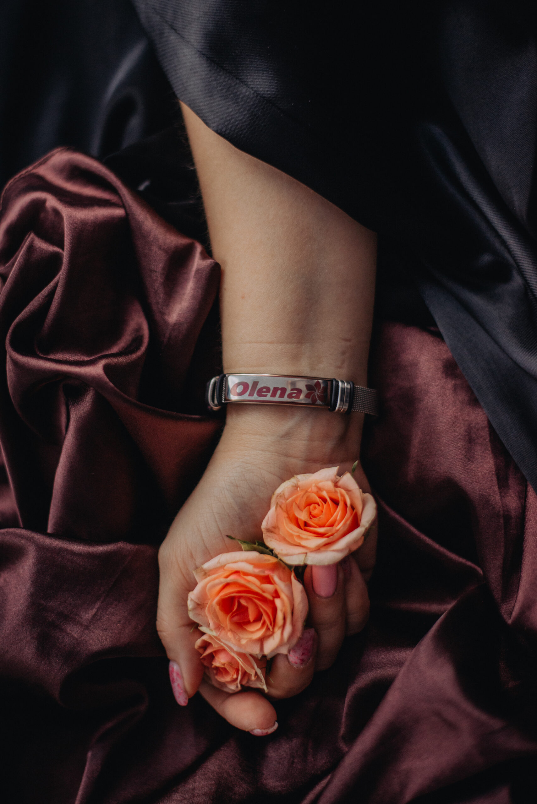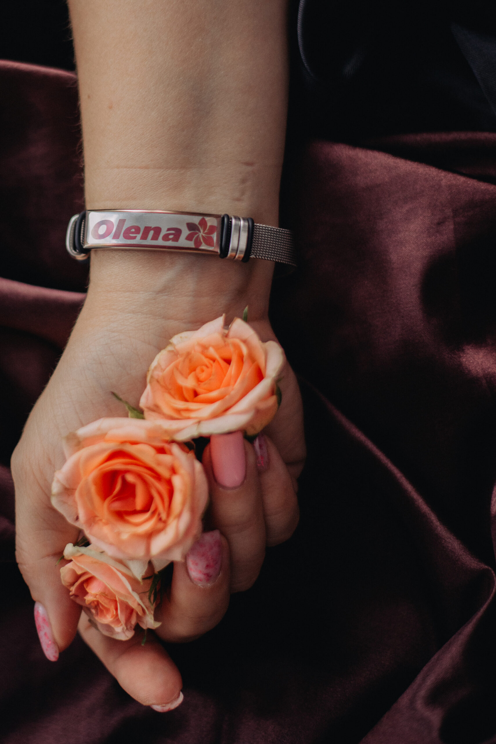 Bransoletka metalowa personalizowana z laserowym grawerowaniem. KOLOR BLASZKI – SREBRNY. Zdjęcie, tekst.