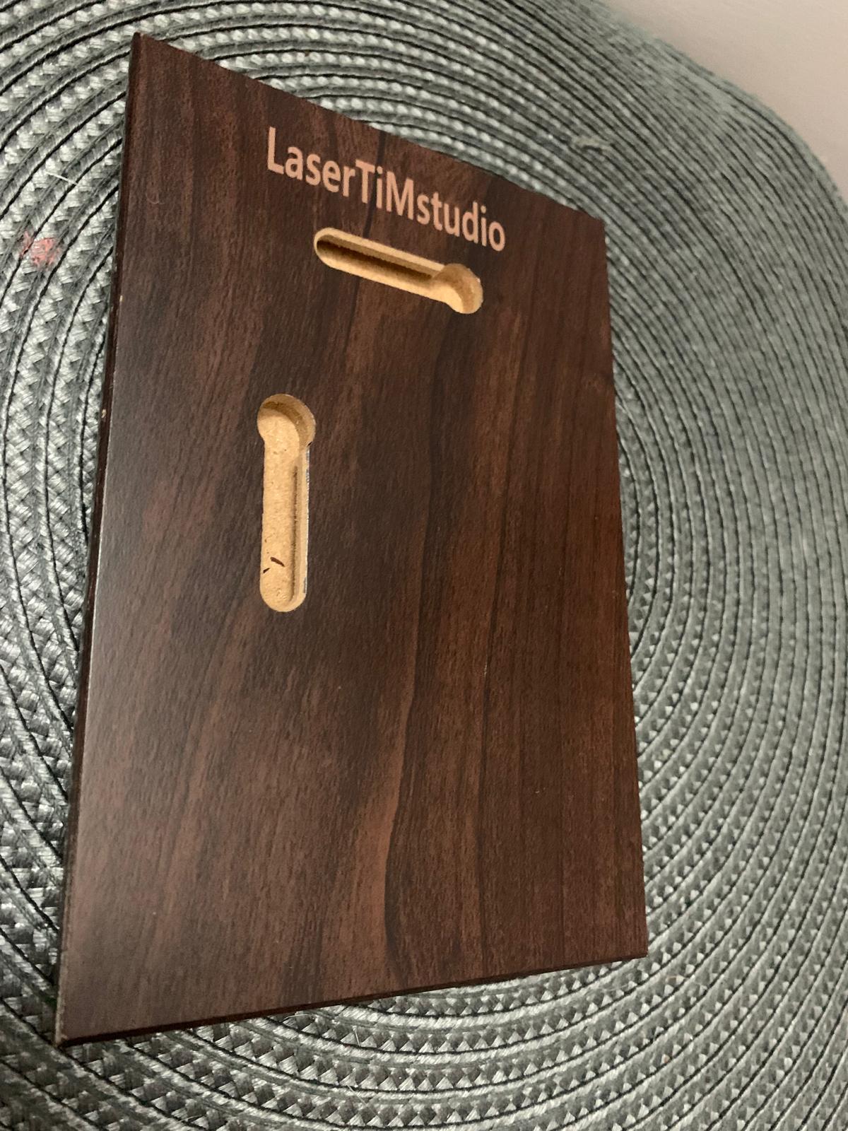 Materiały: MDF, podkład drewniany, laminat grawerski