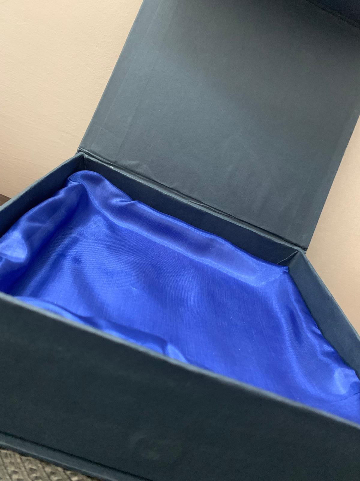 Niezwykle efektowne pudełko prezentowe z papieru ozdobnego w kolorze głębokiego granatu. Twarde, klejone, z klapką zamykaną na magnes.